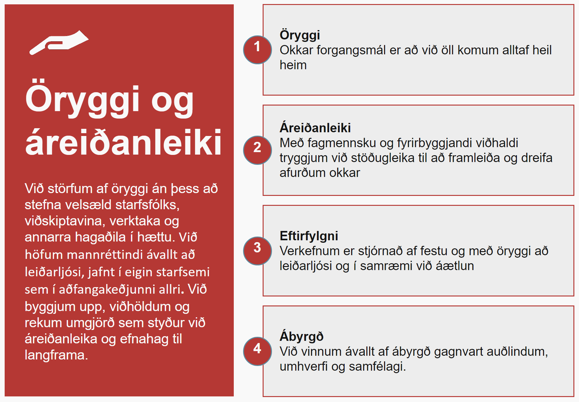 Ábyrgð er lykilþáttur í starfsemi okkar. Á það jafnt við um ábyrgð okkar á auðlindum sem við nýtum eða umgöngumst, ábyrgð okkar í framkvæmdum og rekstri og ábyrgð okkar á allri þjónustu sem við veitum samfélaginu. Ábyrg sýn skuldbindur okkur til þess að afla okkur þekkingar og hún eykur öryggi og áreiðanleika.